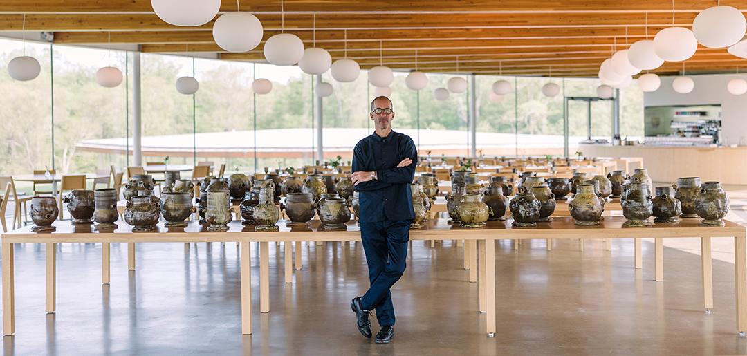 Adam Silverman with installation of Common Ground ceremonial pots at Grace Farms, New Canaan, CT. Photo: Jacek Dolata, courtesy of Adam Silverman.